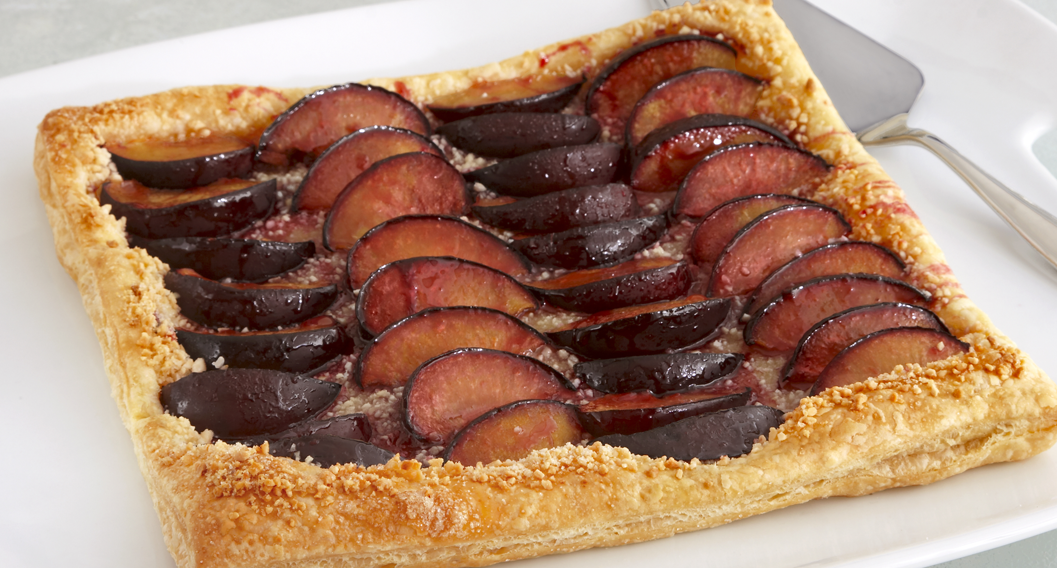 Sprinkle the pastry sheet with the almonds and 2 tablespoons sugar to within 1/4-inch of the edge. Arrange the plum slices on the pastry sheet, overlapping slightly, if needed. Sprinkle the plums with the remaining sugar.