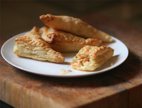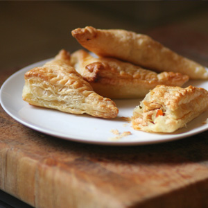 Place about 1 tablespoon chicken mixture in the center of each square. Fold the pastry over the filling to make a triangle and pinch the edges together to seal. Place the empanadas onto the baking sheet. Crimp the edges of the empanadas with a fork.