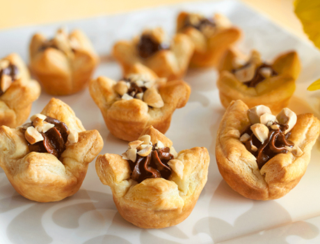 Spoon or pipe about 1 teaspoon hazelnut caramel mixture into each pastry cup. Sprinkle each with about 1/4 teaspoon hazelnuts.